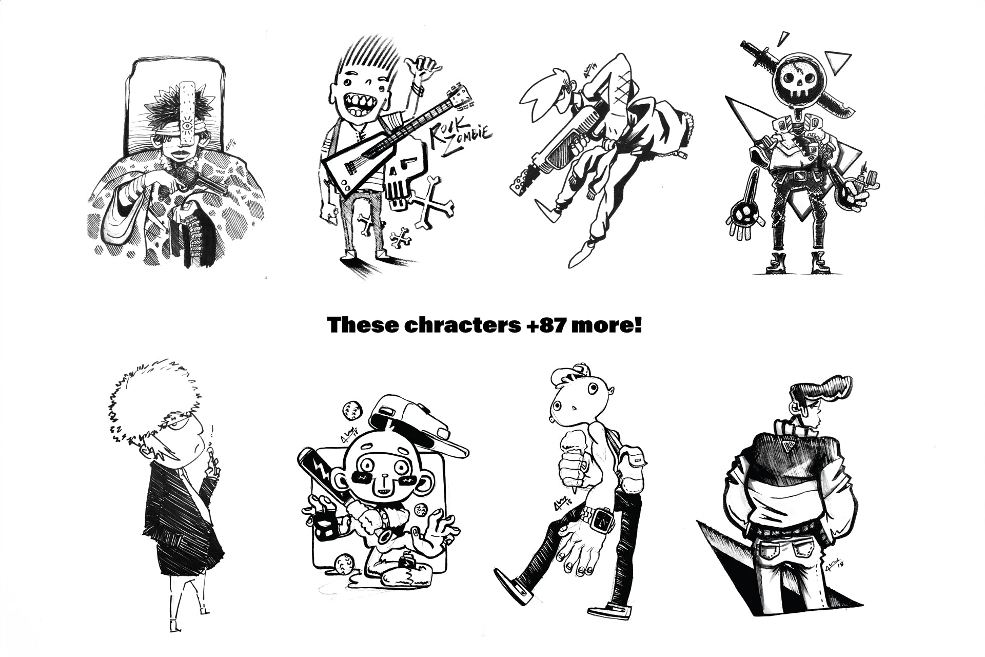 Well that’s what this book is. I’ve compiled nearly 100 of my original character illustrations and stripped them of their color so that YOU can fill them back in. The line art on each is reproduced as it was in my sketchbooks prior to coloring. I’ve left imperfections and sketch lines wherever they were also retained in the final illustration. I hope you’ll have fun with the coloring alone, but I’d even recommend tracing the pages onto separate sheets so that you can render out the line art too.